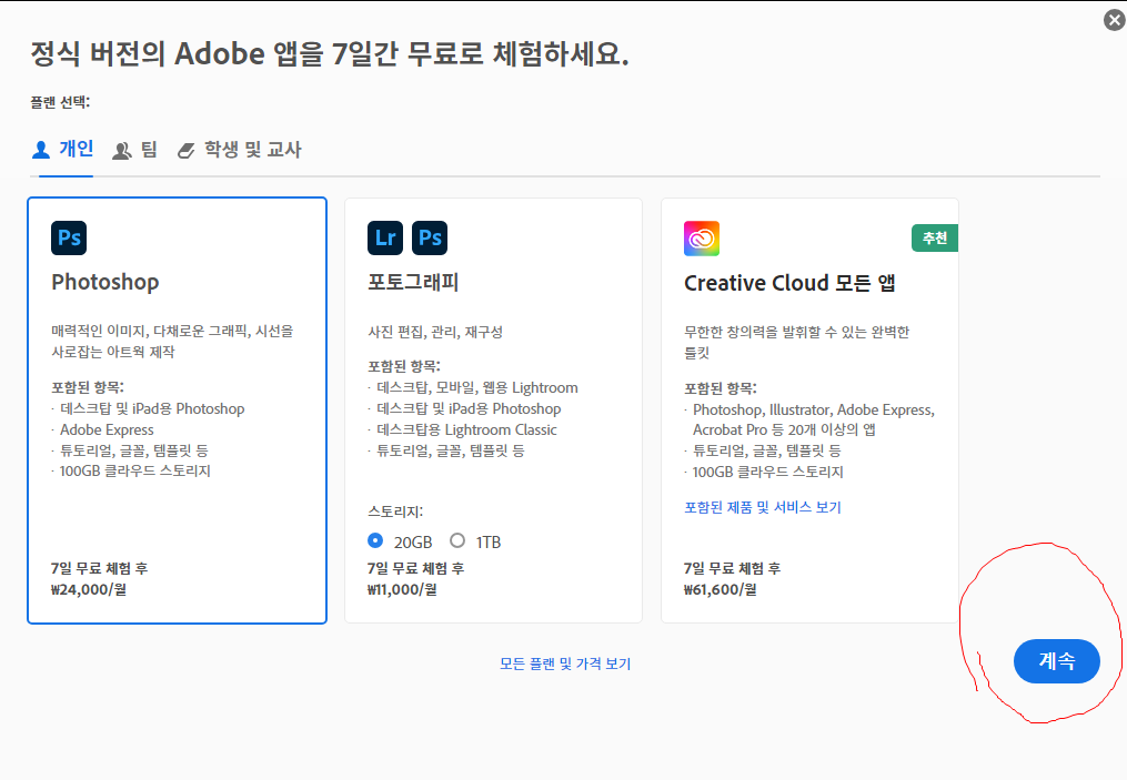이후에 계속 쓰고 싶다면, 유료 구독을 결제해주세요. 이렇게 포토샵 어도비 무료 체험 7일을 시작할 수 있어요.