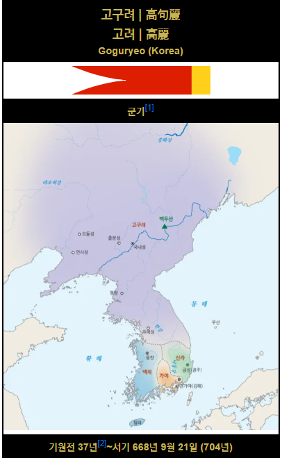 고구려(Koguryo)는 한반도와 동북아시아 지역의 한 시대를 풍요롭게 한 고대 한국의 삼국 중 하나입니다. 고구려는 기원전 37년 동명왕에 의해 건국되었으며, 668년까지 지속되었습니다. 고구려는 한시대 동안 한반도와 동북아시아 지역의 역사와 문화에 큰 영향을 미쳤습니다.