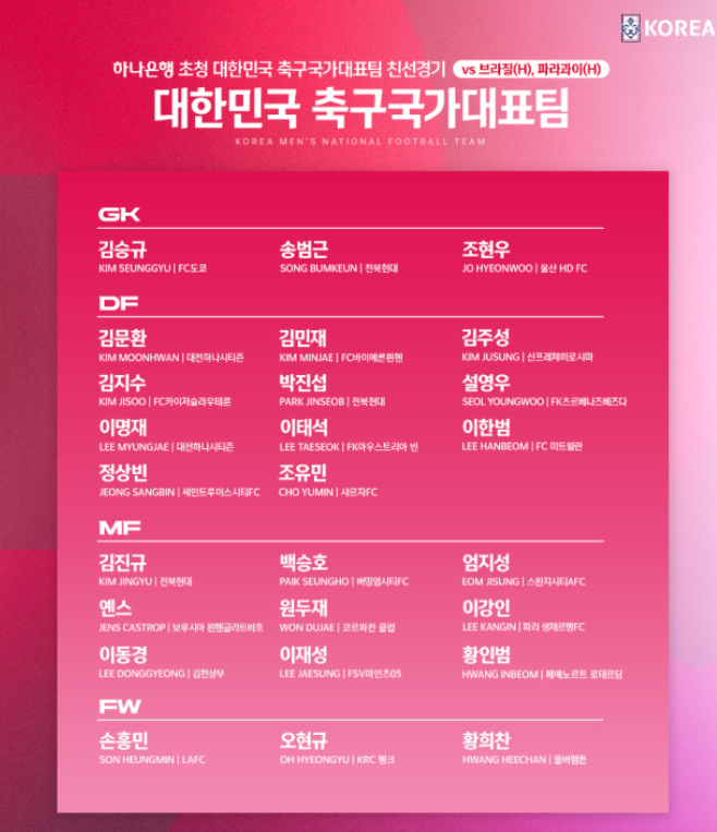 2025년 10월, 한국 축구 국가대표팀이 브라질과 파라과이를 상대로 A매치 친선경기를 치릅니다.